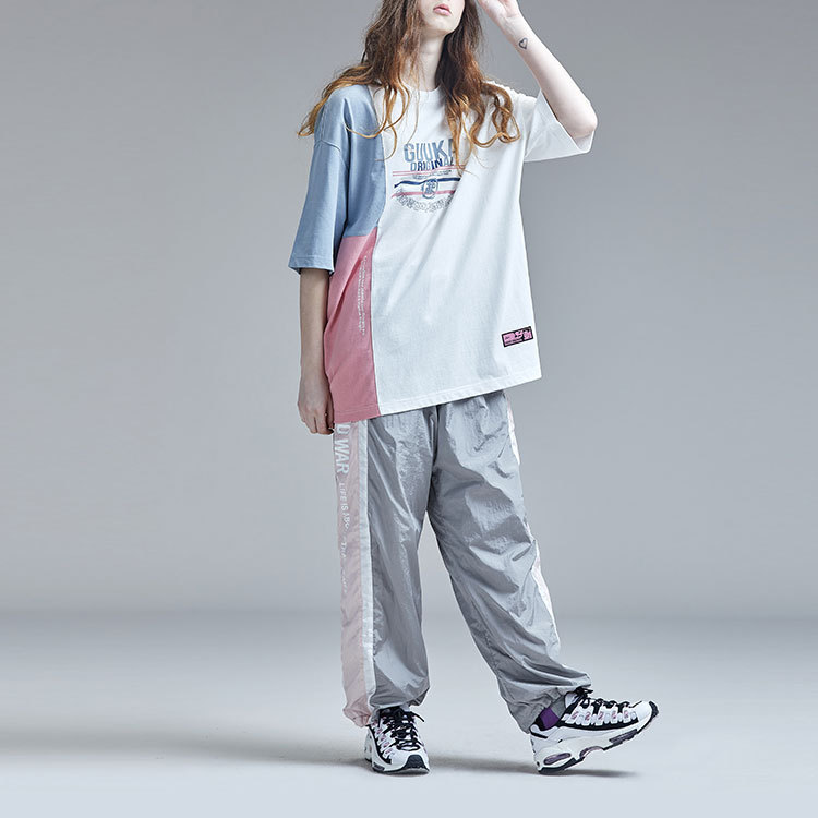 潮牌短袖T恤女宽松嘻哈撞色拼接情侣圆领纯棉港风五分袖T恤